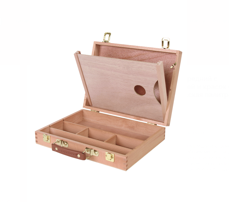 Помощник художника для организации инструментов и поддержания порядка на рабочем месте. В ящике можно хранить кисти, мастихины, краски, карандаши, вспомогательные жидкости и аксессуары. Палитра в комплекте, оснащён ручкой для переноса — удобно брать с собой. Размеры: 32.5x25x7.5 см.