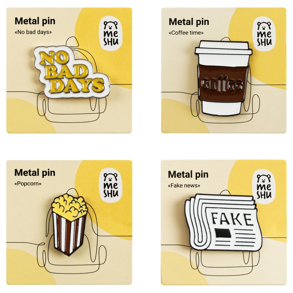 Набор металлических значков от MESHU – оригинальный и модный аксессуар, который преобразит любую вещь. В наборе 4 значка. Застёжка-бабочка позволяет значку надёжно держаться. Эти забавные значки созданы специально, чтобы поднимать настроение своему обладателю.