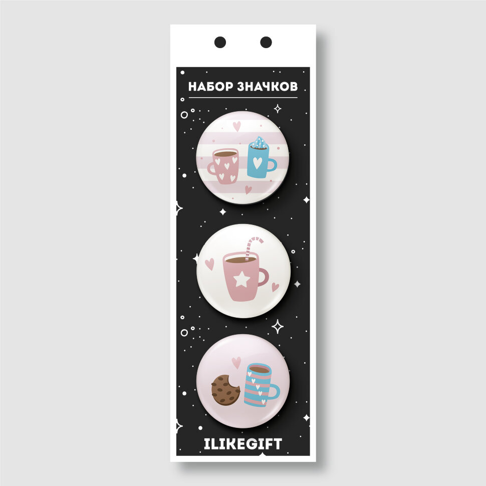 Стильный, яркий и запоминающийся набор значков с дизайнерскими принтами. Значки выполнены из металла с нанесением глянцевой ламинации. Крепление - булавка. В комплекте три значка. Индивидуальная упаковка с плотным хедером, еврослотом и картонной подложкой. Размер каждого значка (диаметр): 3,8 см.