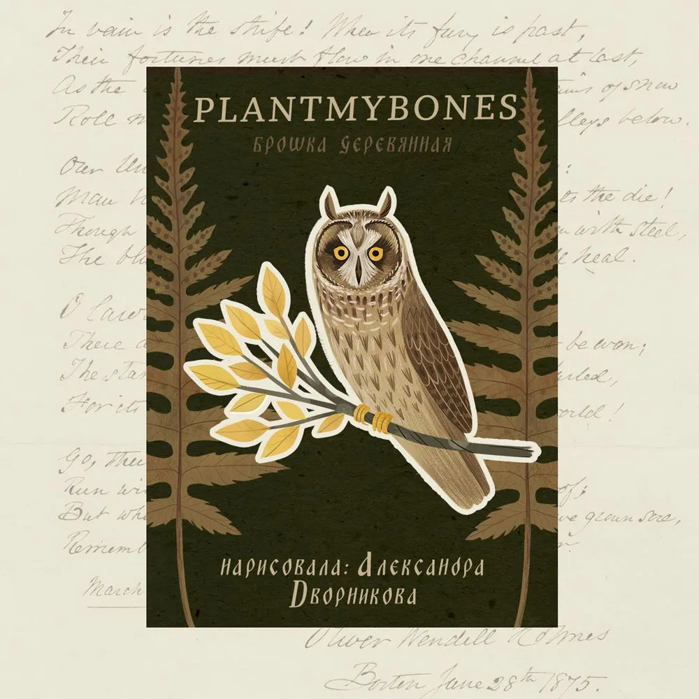 Деревянная брошь с классическим замочком-булавкой на обратной стороне. Брошь выполнена по иллюстрации независимой художницы Александры Дворниковой из Санкт-Петербурга. Работы Александры, вдохновлённые бесконечной любовью к природе, красотой леса и знакомыми с детства сказками, нашли своё новое гармоничное воплощение в повседневных аксессуарах PlantMyBones для вас и вашего дома.