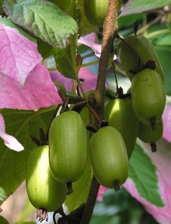 ИспользованиеВысокой популярностью в мире пользуются плоды культурных десертных сортов актинидий, известных как киви. Среди множества видов актинидии наиболее привлекательна для нашего сурового климата актинидия коломикта или пестролистная, выдерживающая морозы до -40 °C.ДеревоАктинидия пёстролистная (коломикта) растёт и плодоносит на одном месте до 30–50 лет, достигая в высоту от 3 до 7–8 м. Благодаря пёстрой окраске листьев она нарядна и привлекательна в течение всего сезона. Весной и летом цветовая палитра изменяется от серебристо-бело-зелёной до розовато-малиновой, а осенью — до пурпурно-красной, карминной.ПлодыОчень крупные плоды с сильным ананасным ароматом. Средняя масса ягоды — 4 г.Срок созреванияПозднего срока созревания, в конце августаСамоплодностьРастение двудомное.Для опыления необходим вблизи мужской экземпляр.ЗимостойкостьМорозостойкость высокая.до -45Возраст саженца1 годУсловия выращиванияПредпочитает полутень и хорошо защищенные от ветра места.