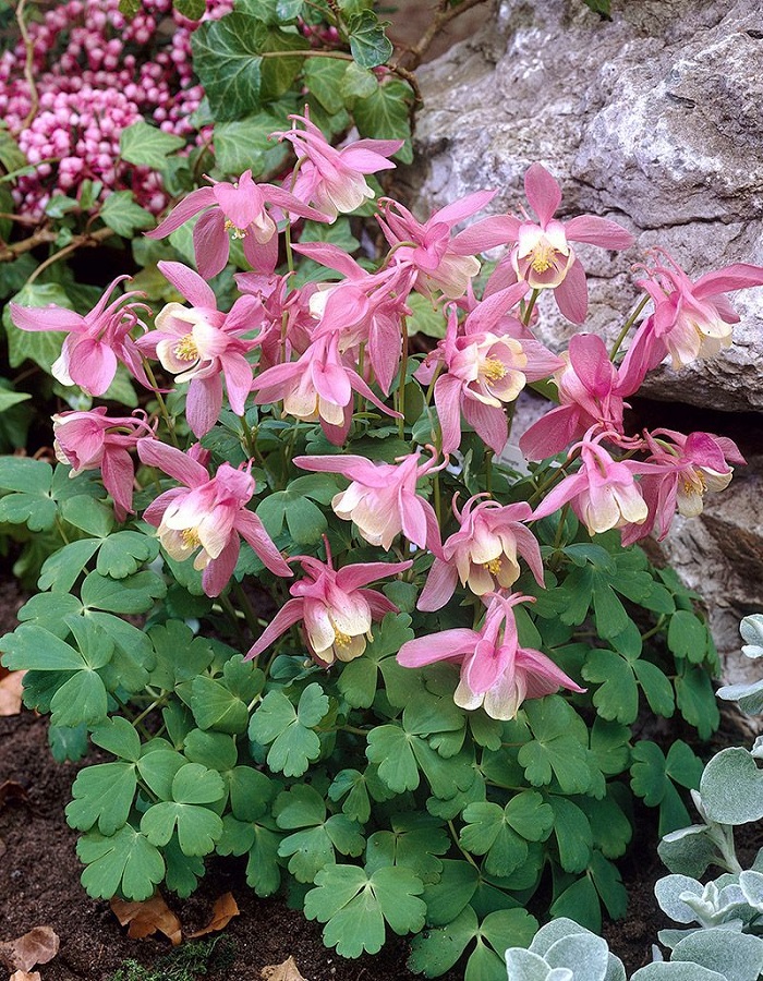 Применение и особенностиАквилегия используется в ландшафтном дизайне при декорировании садовых участков, бордюрных зон, рокариев, робаток и клумбовых насаждений. Подходит как для одиночных, так и групповых посадок.Дерево (куст)Вырастает до 85 см в высоту. Куст раскидистый. Стебель длинный, слегка опушенный. Побеги слабоветвящиеся. Корневая система хорошо развитая.ЛистьяЛистья крупные, тройчато-рассеченные, зеленые.Цветы (соцветия)Венчик цветка состоит из пяти раздельных лепестков в виде воронки, заканчивающихся шпорцами, и пяти чашелистиков.Цветы двуцветные, розовые с белым.ЗимостойкостьЗимостойкость высокая, до -34 °C.Возраст саженца1 годУсловия выращиванияНеприхотлива в уходе, раастет в слегка затененных участках.