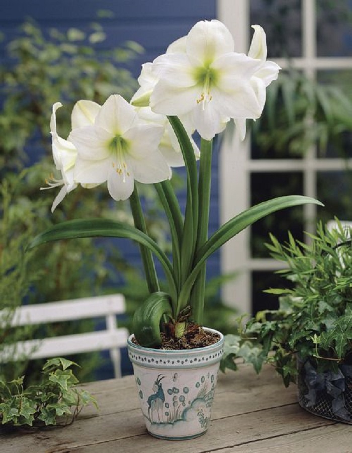 Амариллис (или гиппеаструм) Монт Бланк – изысканно цветущее комнатное луковичное растение, высотой 50 см с листьями изящной вытянутой формы. На цветоносе развивается 5-6 белоснежных цветков, диаметром 20-25 см. Зацветает амариллис через месяц-полтора после посадки.