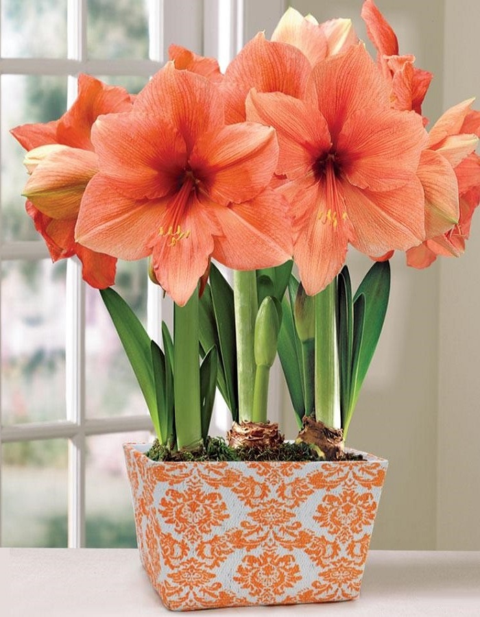 Амариллис (или гиппеаструм)  Рилона – изысканно цветущее комнатное луковичное растение высотой 50см с листьями изящной вытянутой формы.  На цветоносе развивается  5-6 лососевых цветков диаметром до 25см. Зацветает амариллис через месяц-полтора после посадки.