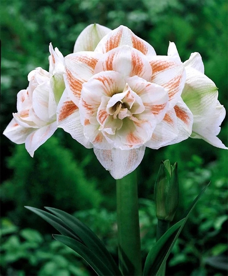 Амариллис "Нимф" (Nymph) - это многолетнее луковичное растение. На высоких, до 70 см, цветоносах распускается 5-10 махровых цветков белого цвета с зеленоватым оттенком и живописными красными мазками по лепесткам. Цветки 15-25см в диаметре. Используется как в качестве комнатной культуры, так и на срезку