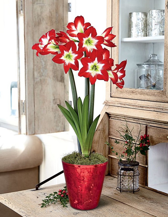 Амариллис — нежный цветок для горшочного выращивания. Относится к луковичным растениям. Луковица округло-конической формы. Имеет плоские, длинные, узкие листья 50-70 см и высокие, до полуметра, цветоносы. Данный гибрид — необычный, двухцветный. Цветок немахровый, красный, центр белый, диаметр 15-25 см, содержит 4-12 цветков. Он выглядит очень привлекательно, создаёт приятный акцент в обстановке. Любит тепло, хорошую освещённость с полуденным притенением, дренированный (желательно песком) грунт и умеренный полив. Хорошо подходит для ландшафтного дизайна.