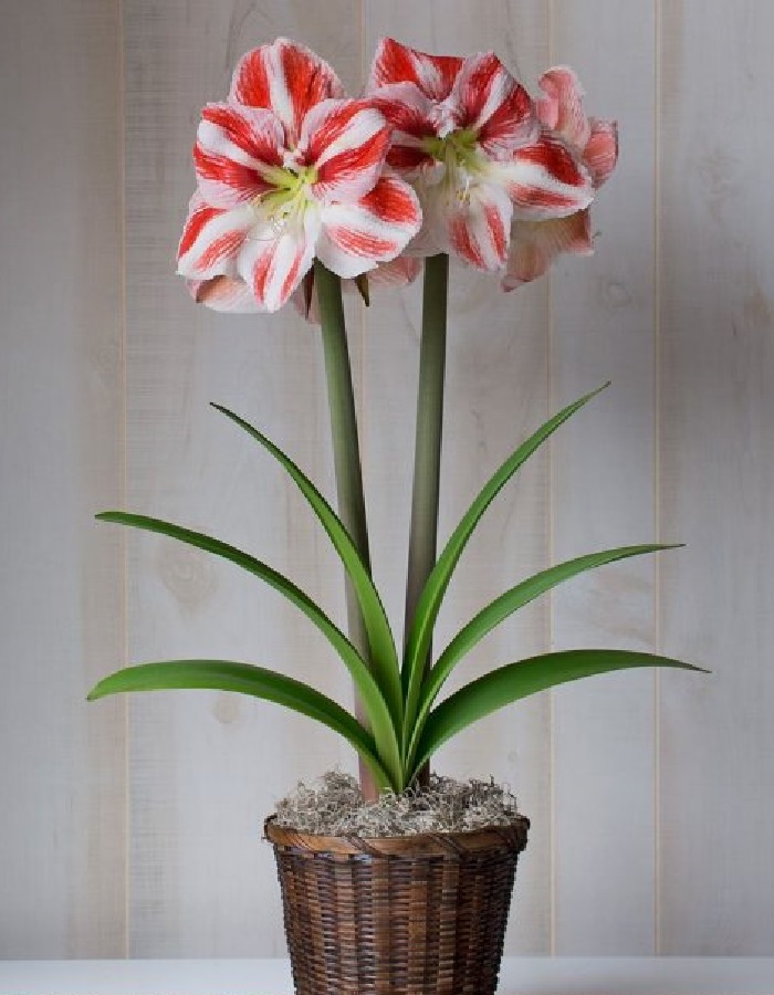 Амариллис (или гиппеаструм) Клоун – изысканно цветущее комнатное луковичное растение высотой 50см с листьями изящной вытянутой формы. Луковица дает 2-3 цветоноса, на каждом из них 3-4 красных цветка с белым краем и белой полосой, диаметром 20-25см. Зацветает амариллис через месяц-полтора после посадки.