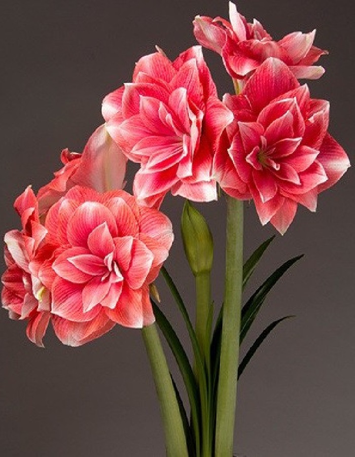 Амариллис (гиппеаструм)- До чего красив цветок: Тонкий длинный стебелёк, граммофонов целый ряд - Яркий праздничный наряд. Луковица состоит из короткого утолщенного стебля и сомкнутых замкнутых чешуй, округлая или округло-коническая. Листья линейные длиной 50-70 см. Цветонос представляет собой безлистный стебель от 35 до 80 см высотой. Цветки 15-25 см в диаметре, воронковидные или трубчатые, самой различной окраски: ярко-красные, темно-вишневые, розовые, оранжевые, белые.Дабл Дрим  - высота растения 50-70 см. Цветок махровый, розовый с белыми кончиками.