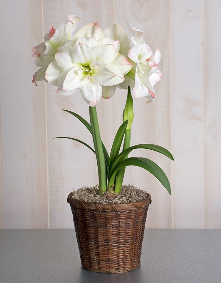 Ежегодно из чешуйчатой луковицы многолетника выходит несколько мощных, гладких, вертикальных побегов высотой около 60 см. В прикорневой области стебля образуется двухрядная розетка из линейных, темно-зеленых листьев. На вершине цветоносов расцветают 4-5 крупных, махровых, воронковидных цветка. Диаметр 15-25 см.Их отогнутые, белоснежные с розовыми краями, глянцевые лепестки в бутоне располагаются поярусно.