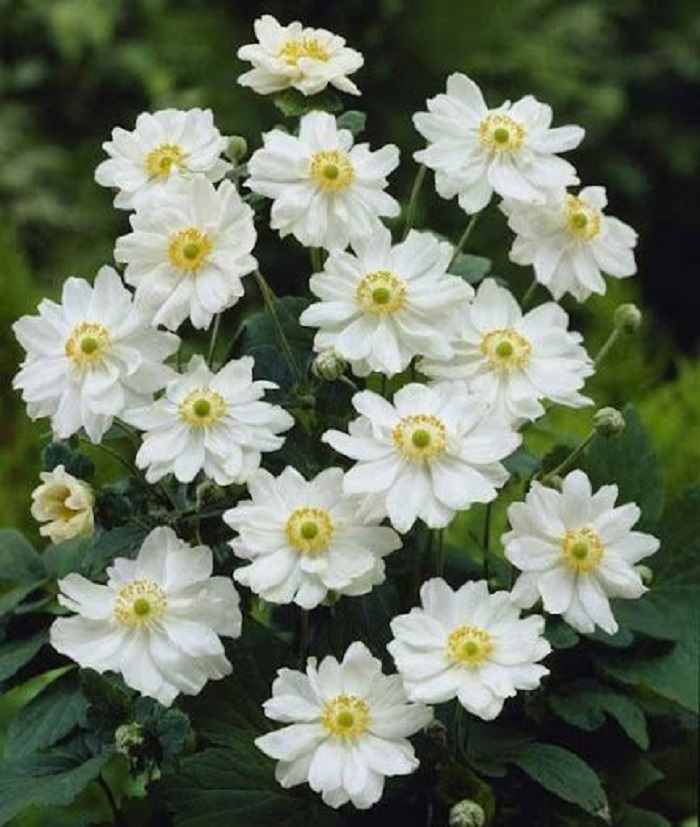 Анемона гибридная Велвинд цветет одиночными крупными цветками на тонких стеблях разной длины. От этого ее куст похож на небольшой смерч, взметнувший и перемешавший гигантские снежинки.