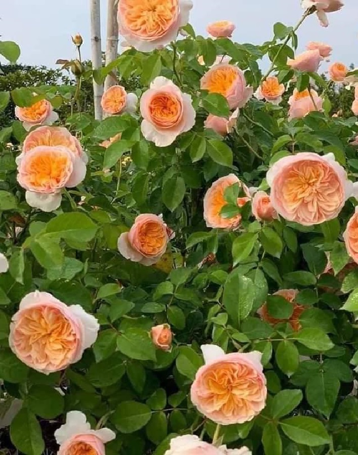 На побегах посажены одиночные пышные бутоны абрикосового цвета, которые раскрываясь, превращаются в шикарные розы, внешне напоминающие пионы. Цветок, диаметр которого достигает 10 см, имеет плотную структуру, состоящую из 85-90 тонких лепестков с волнистыми краями. Махровая роза приобретает нежно-персиковый или светло-абрикосовый окрас.