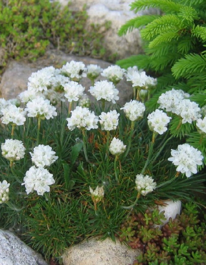 ПрименениеАрмерия чаще всего растение используют, чтобы украсить бордюры, рокарии и каменистые горки.Дерево (куст)Армерия приморская Морнинг Стар Вайт - достигает высоты около 15-20 см и ширины около 30 см. Листья узкие, линейные, зеленые или серо-зеленые, длиной около 5-10 см. Листья образуют плотные розетки у основания растения.Цветы (соцветия)Цветы маленькие, белые, собраны в головчатые соцветия на длинных цветоносах. Цветение обычно происходит весной или ранним летом, часто повторяется в течение сезона. Всего этот период занимает не менее 2 месяцев. Является морозоустойчивым растением и способна выжить при понижении температур до -35°C.ЗимостойкостьЗимостойкость высокая.Возраст саженца1 годУсловия выращиванияВысаживают на солнечные места. Зимует без укрытия. Почва легкая супесчаная, не переносит извести.