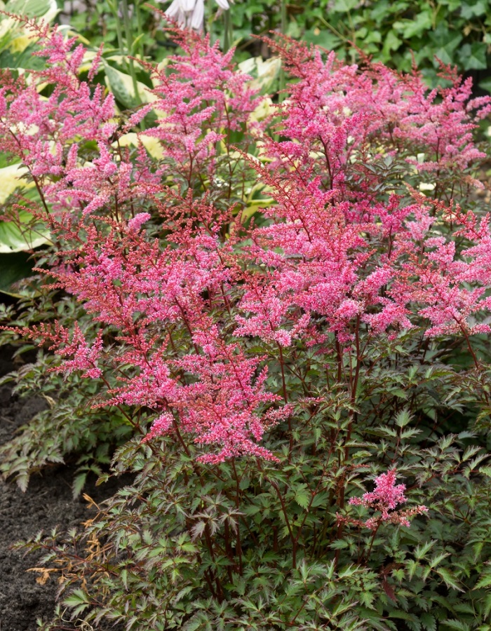 Соцветия ярко-розовые, пушистые, появляются с июля до сентября. Листья астильбы радуют своей необычной расцветкой, которая меняется в зависимости от сезона. Весной они имеют насыщенный бордовый цвет, а к лету зеленеют, оставаясь тёмно-рубиновыми только по краям. Лучшие посадки для сорта Ки Вест – пурпурные, фиолетовые или красные. Они прекрасно смотрятся рядом с домом или под кронами лиственных деревьев. Астильба Ки Вест не высокая: всего 40 см – 45 см. Как и все другие сорта астильбы, Ки Вест отличается своей особенностью расти на влажных почвах. Однако, во времена краткосрочной засухи растение не вянет, а стойко переносит непогоду. Поэтому, можно применить данную астильбу и в солнечных плотных цветниках.