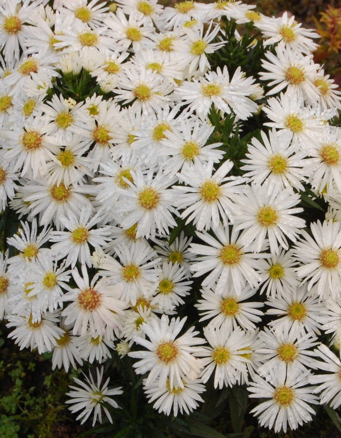 Куст пышный, почти шаровидный. Высота во время цветения до 30 см. Цветет в августе-сентябре. Соцветия-корзинки мелкие, ромашковидные, диаметром 2,5-3 см. Лепестки белые, середина соцветия желто-оранжевая.