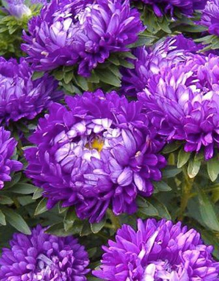 Растение колонновидной формы с прочными цветоносами высотой 55-60 см. В пору цветения на одном кусте одновременно распускается до 20 махровых сине-фиолетовых соцветий диаметром 6-7 см. Астры обладают высокой холодостойкостью – хорошо переносят заморозки до -3-4°C. Цветение длительное и обильное.