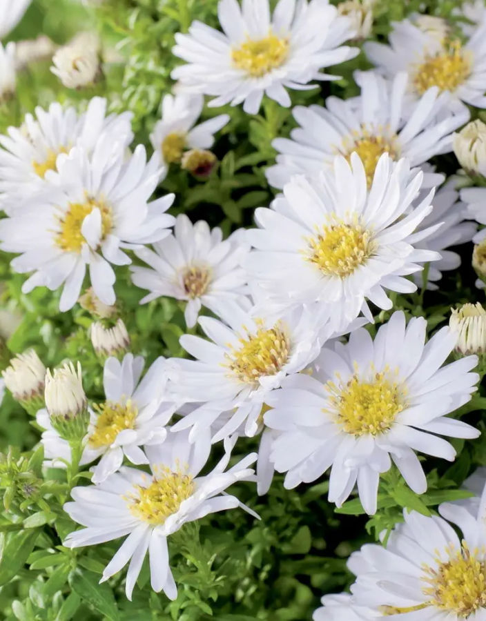 Астра кустарниковая Шникиссен – многолетнее травянистое растение. Высота растения всего 40 см. Цветет с середины сентября по октябрь, поэтому в северных районах иногда не успевает отцвести до заморозков. Листья темно-зеленые, заостренные. Цветки небольшие, в диаметре до 3 см, белоснежные, с ярко-жёлтым диском.