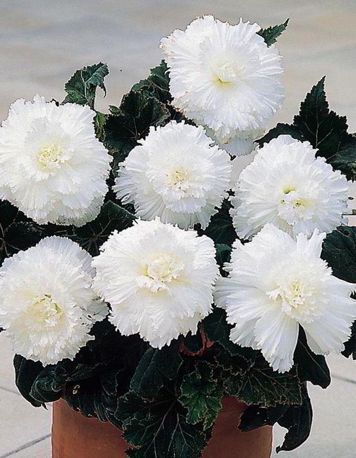 Бегония бахромчатая белая – клубневое растение высотой 20-30см. Красивы ее зеленые сердцеобразные листья с неровно зубчатыми краями, прекрасны и махровые белоснежные цветки, похожие на гвоздику, диаметром 8-10см.