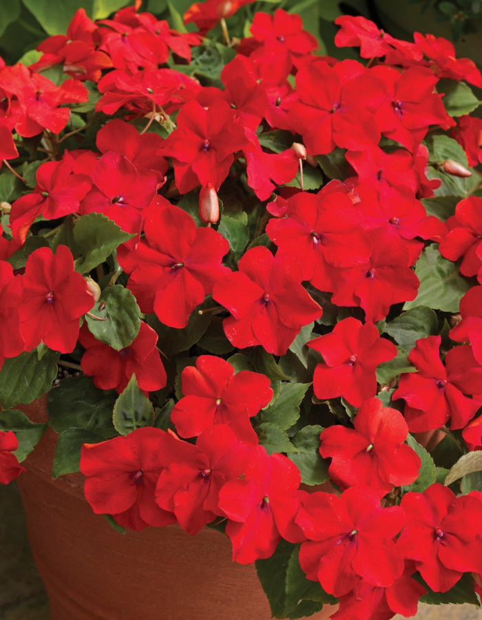 Бальзамин Маячок Красное Солнце каскадного (полуампельного) типа. Цветки диаметром 3-4см.