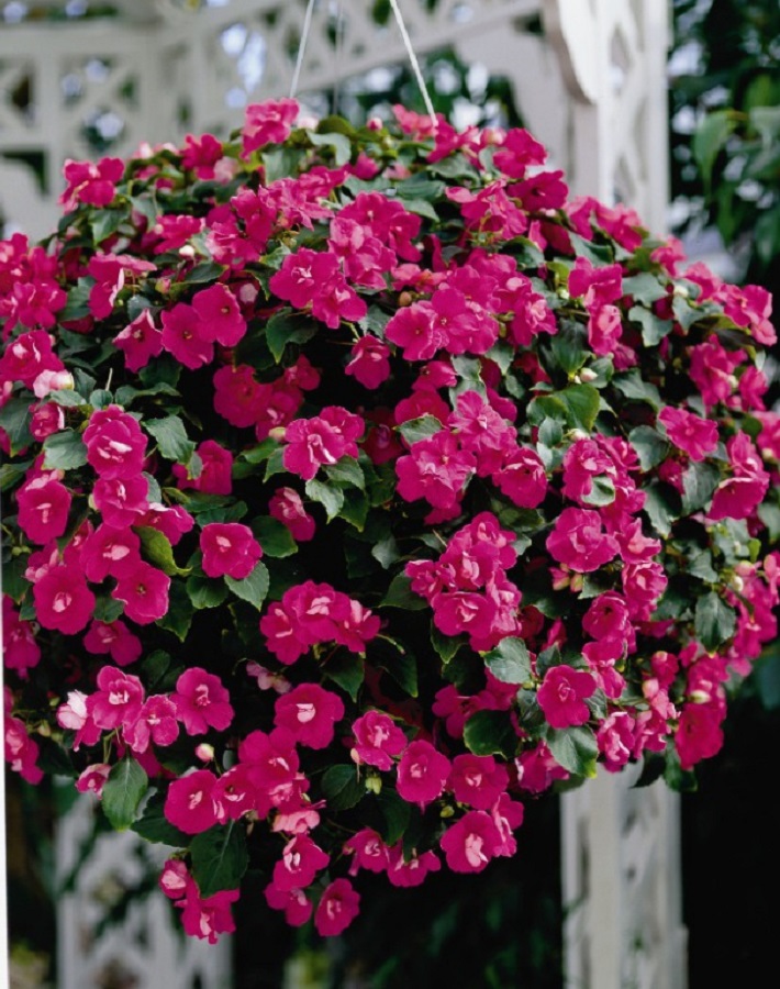 Этот огромный ампельный бальзамин просто находка для вертикального озеленения.Одного растения достаточно для формирования роскошной подвесной корзины или вазона.Неплохо переносит дожди.В зимний период его можно сохранить до следующего сезона в домашних условиях.