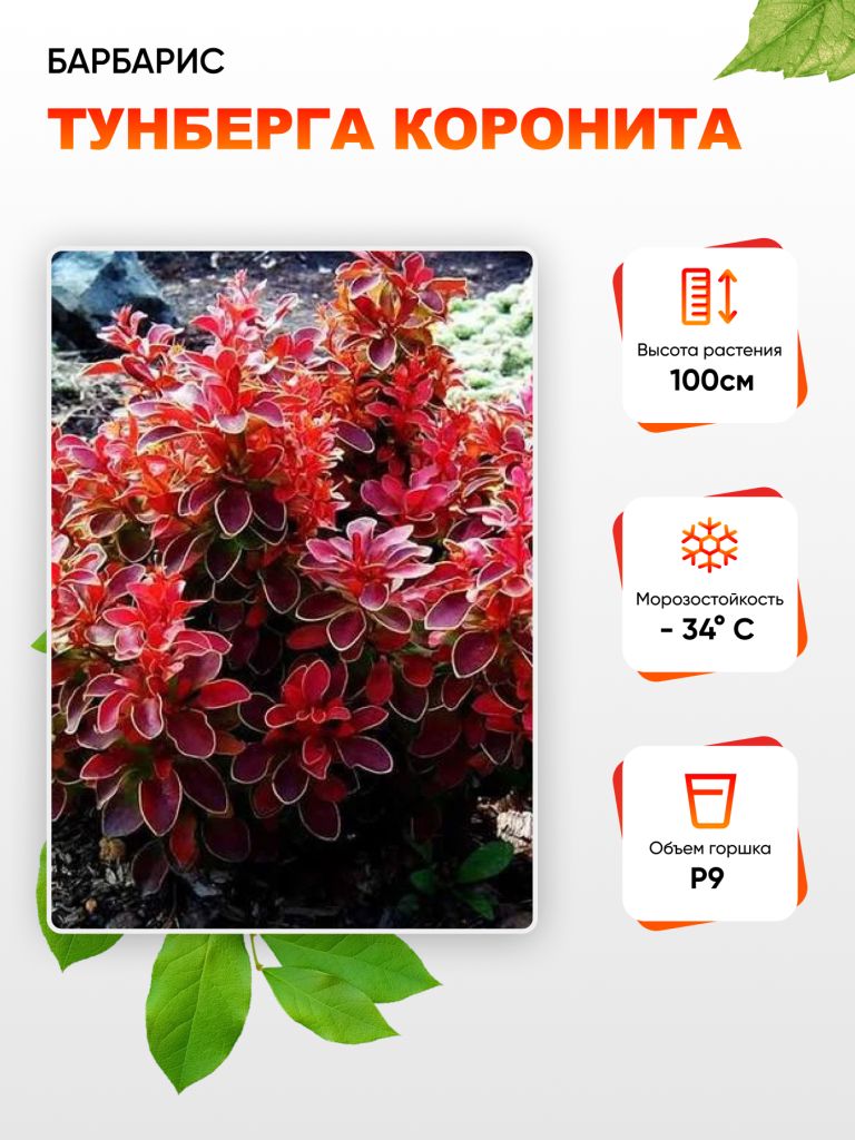 Применение,особенностиИспользуется в одиночных и групповых посадках, для создания живых изгородей, в миксбордерах.КустРаскидистый кустарник с длинными побегами,высота 80-100 см.ЛистьяЛистья яркие, тёмно-пурпурные с желтовато-зелёной каймой по краю листа.Цветы/соцветияЦветки желтые с красноватым оттенком, одиночные или собраны в маленькие кисти появляются в мае. Плоды - ягоды, красные, несъедобные.Возраст саженца1 годЗимостойкостьЗимостойкость высокая, до -34 °C.Условия выращиванияДля посадки лучше всего подходят солнечные участки, но растение также переносит легкое затенение. Почва должна быть легкой, питательной с высоким уровнем кислотности.