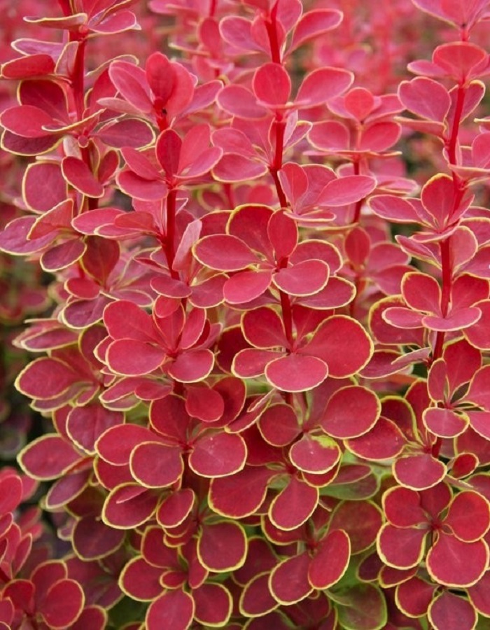 ветви прямостоячего типа, красного оттенка; покрытие листвой плотное, густое; оригинальная листва имеет форму округлого типа, напоминает по форме монету;цвет листьев красный или сочно-оранжевый; длина листка около 3 см;ЛистьяНа листьях зрелых растений появляется окантовка желтого оттенка; высокая декоративность обусловлена не только красотой листвы, но и цветением в конце весны; соцветия одиночного типа, желтоватые внутри, с красными лепестками;цветение обильное, усыпает всю ветку, но непродолжительное – меньше месяца; зрелые растения имеют колючки на ветках, размером около 1 см;ЗимостойкостьЗимостойкость средняя, до -29 °C.Возраст саженца1 годУсловия выращиванияПредпочитает солнечные места, Зимостойкий сорт.