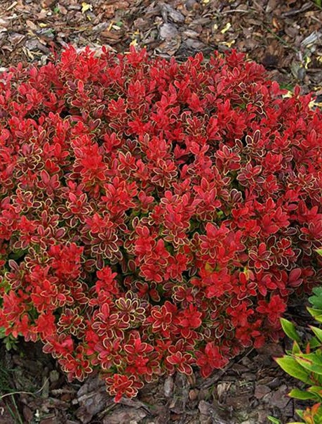 Применение.Используется для создания живых изгородей, бордюров, в древесно-кустарниковых композициях.КустКомпактный карликовый декоративный кустарник 50-60 см высотой, с округлой кроной.>ЛистьяЛистья мелкие овальные, до 2 см длиной, блестящие, пурпурно-оранжево-красные с желтой каймой по краю.Цветы/соцветияЦветет одиночными желтыми цветами в мае-июне. Плоды красного цвета созревают в сентябре-октябре.ЗимостойкостьЗимостойкость средняя, до -29 °C.Возраст саженца1 годУсловия выращиванияДля посадки лучше всего подходят солнечные участки, но растение также переносит легкое затенение. Почва должна быть легкой, питательной с высоким уровнем кислотности.