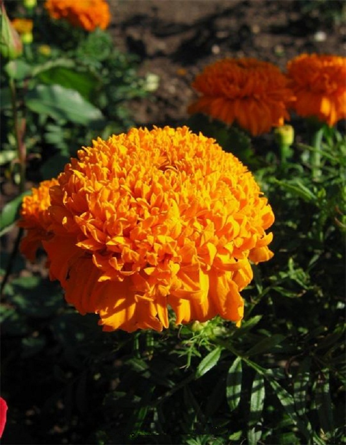 Оригинальные махровые цветки. Компактный густо облиствленный куст с махровыми крупными соцветиями высотой до 20 см. Соцветия гвоздиковидные, ярко оранжевые, диаметром 5-6 см. Растение светолюбивое, засухоустойчивое. Предпочитает солнечные места. Цветет обильно с июля по сентябрь. Используют для клумб, рабаток, бордюров, садовых кашпо и балконов.