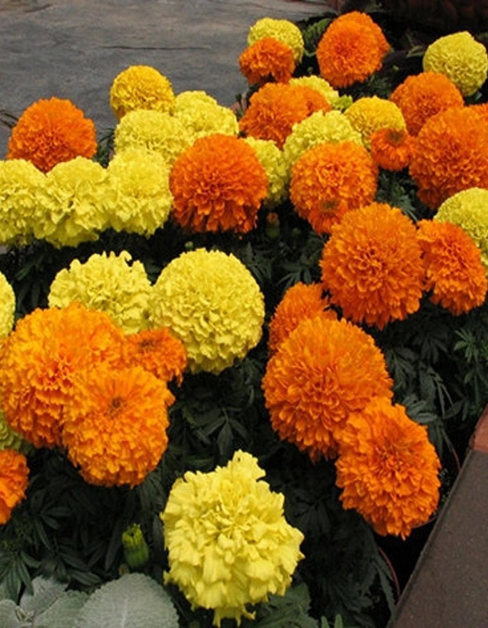Потрясающая смесь однолетников высотой 25-30 см.Соцветия густомахровые, крупные, диаметром до 10см, насыщенного лимонного, золотого и оранжевого цвета.