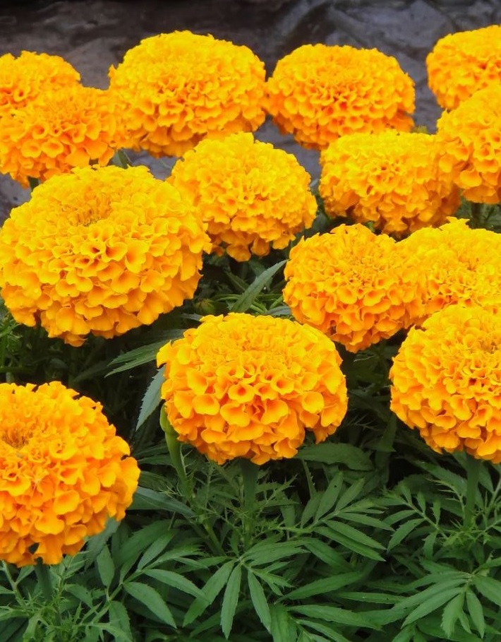 Компактные густо облиственные кусты с махровыми крупными соцветиями высотой до 70см. Соцветия шаровидные, махровые, золотисто оранжевые, диаметром 8-10см, шикарно смотрятся на фоне зелёной листвы. Растения светолюбивые, засухоустойчивые. Предпочитают солнечные места. Цветут обильно с июня по октябрь. Используют для клумб, в группах и для срезки. Также используют для посадки среди огородных культур для отпугивания вредителей.