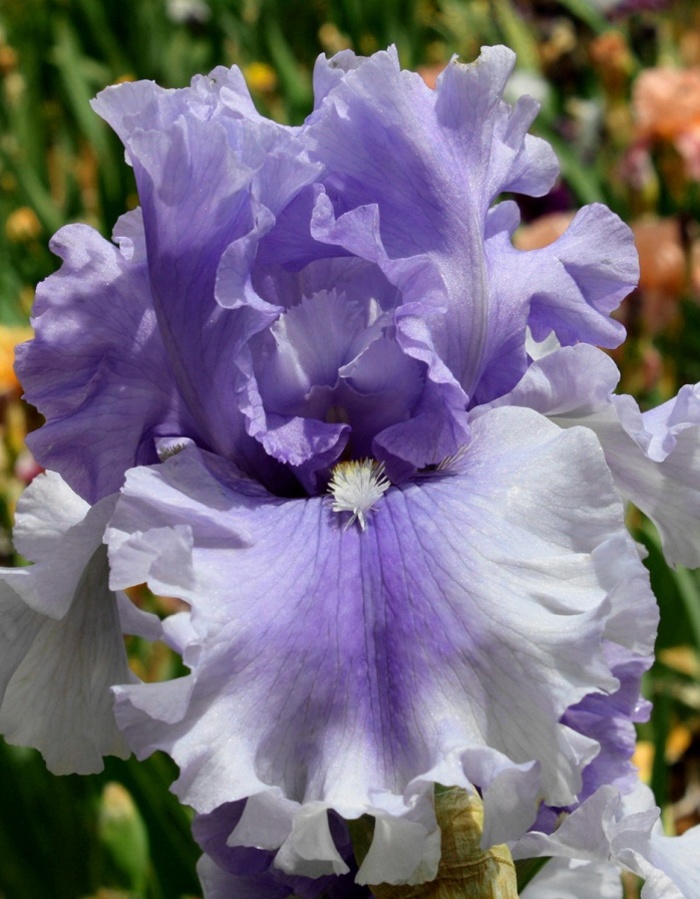 Ирис Таймскейп – корневищное растение высотой 70см. Мечевидные листья с восковым налетом собраны в вееровидные пучки. Цветки .слегка гофрированные,верхние лепесточки светло-лилового оттенка собраны в изящный купол, фолы белые, гофрированные с темным штрихом по центру, бородка нежно-голубая,размером 10-15см, источают сладковатый тонкий аромат. Цветет с мая по июнь. Используется для всех типов ландшафтного дизайна (украшение клумб, бордюров, рабаток). Прекрасно смотрится в срезке.