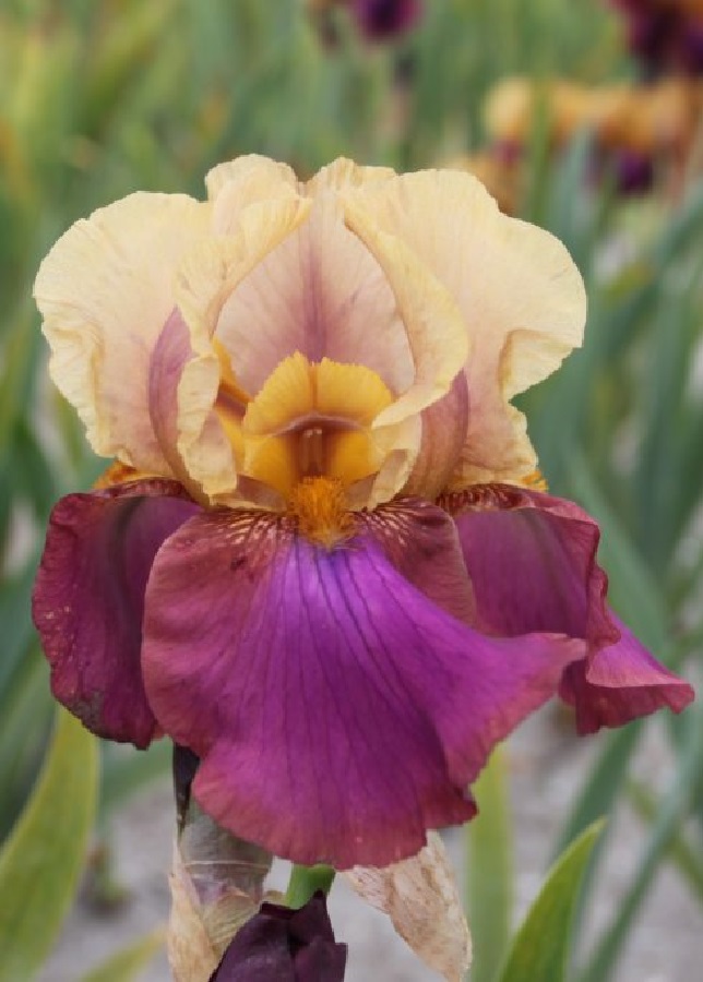 Ирис Гала Мадрид – корневищное растение высотой 80-90см. Мечевидные листья с восковым налетом собраны в вееровидные пучки. Верхние лепестки цветков желтые, нижние – фиолетовые в центре и пурпурные по краям. Цветки, слегка гофрированные, размером 10-15см, источают сладковатый тонкий аромат. Цветет с мая по июнь. Используется для всех типов ландшафтного дизайна (украшение клумб, бордюров, рабаток). Прекрасно смотрится в срезке.