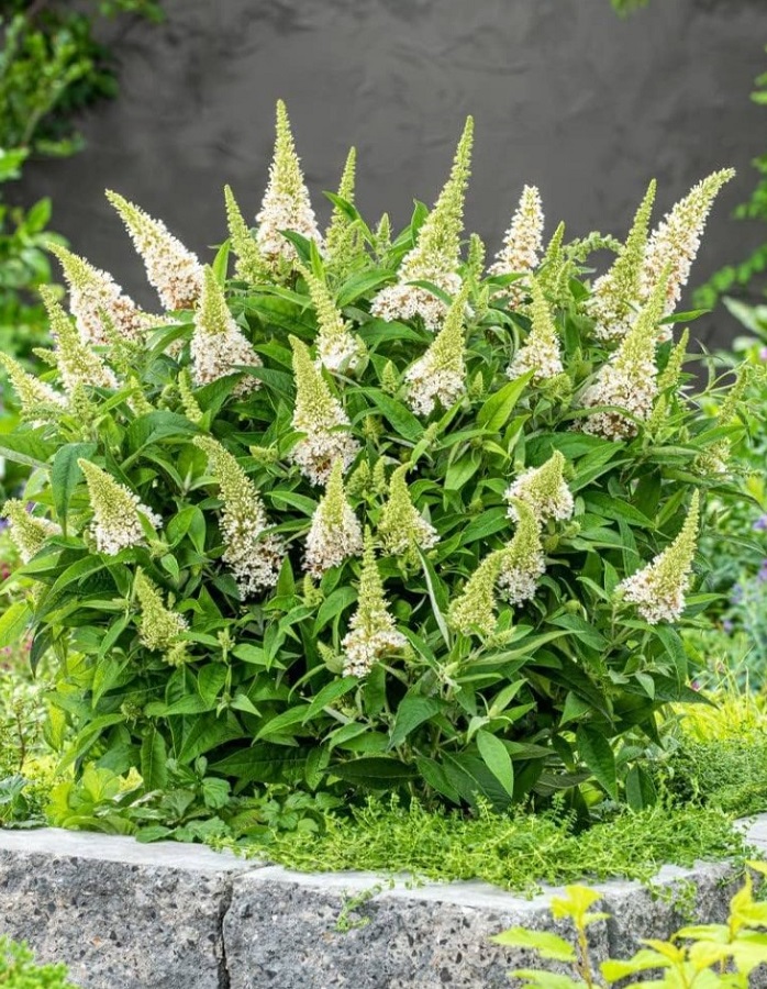 Применение,особенностиМиниатюрная буддлея из серии Butterfly Candy, хорошо подходящая для небольших живых изгородей, клумб и в горшках на балконе и террасе. Привлекает пчел и бабочек. Куст компактный, прямостоячий, до 80 см в высоту и ширину. Имеет естественную округлую форму. Листья серебристо-зеленые, цветки белые.Цветы/соцветияВерхушки побегов покрывают рыхлые, пышные соцветия конической формы. Цветки маленькие, белые и ароматные. Цветение в июне-сентябре, после удаления увядших цветов постоянно образуются новые соцветия.ЗимостойкостьЗимостойкость средняя, до -23 °C.Возраст саженца1 годУсловия выращиванияКустарник буддлея боится холода. Данный нюанс требует правильной организации зимнего укрытия кустарника. Перед этим буддлею необходимо обрезать. Не следует бояться, если это будет сделано очень коротко: весной растение удивит своей новой, более роскошной кроной. Затем куст буддлеи можно утеплить сухой листвой, сеном или опилками, накрыв сверху деревянным ящиком или другой подручной конструкцией.