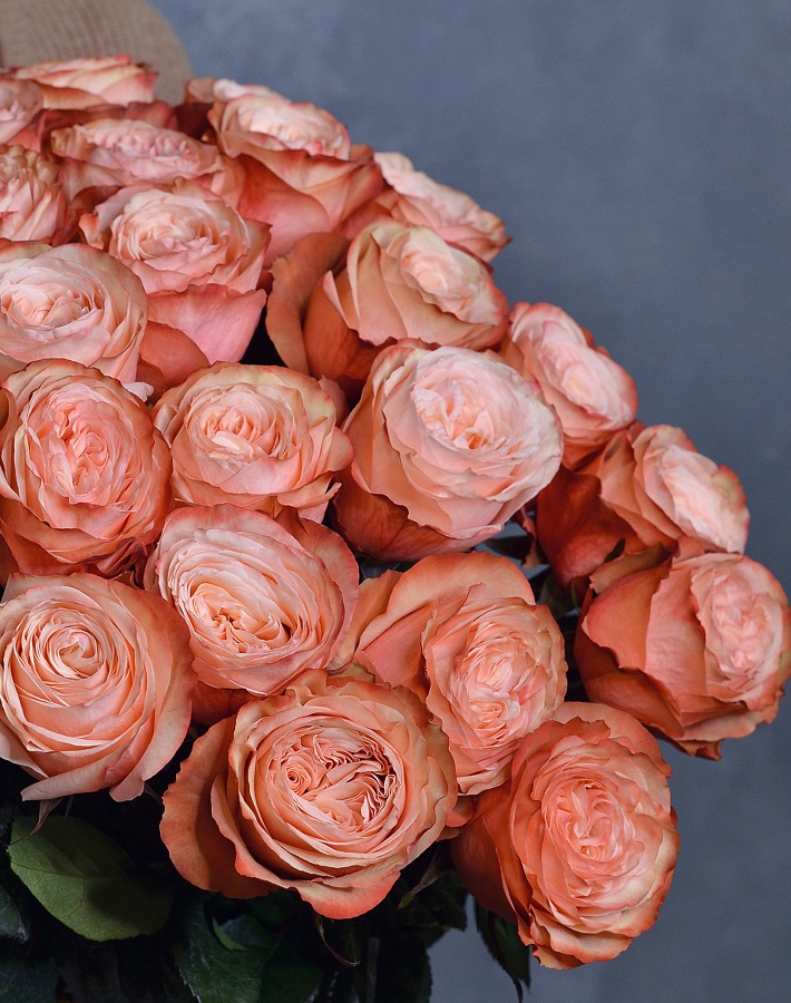 Окрас цветков напоминает благородные оттенки шампанского, переходящие в персиковые тона. Основной окрас лепестков оранжевый, персиковый, коралловый. Цветки в диаметре достигают 5-6 см, они махровые, с 55 лепестками. Размещение цветков одиночное. Центральные лепестки с оранжевыми или розовыми оттенками к краям постепенно приобретают персиковые тона. Отличительные особенности культуры заключаются в необычайной пышности бутонов, источающих слабый аромат, и тоненьких прямых стебельках. Идеально такие розы смотрятся в букетах и радуют глаз на клумбах.Возраст саженца1 год