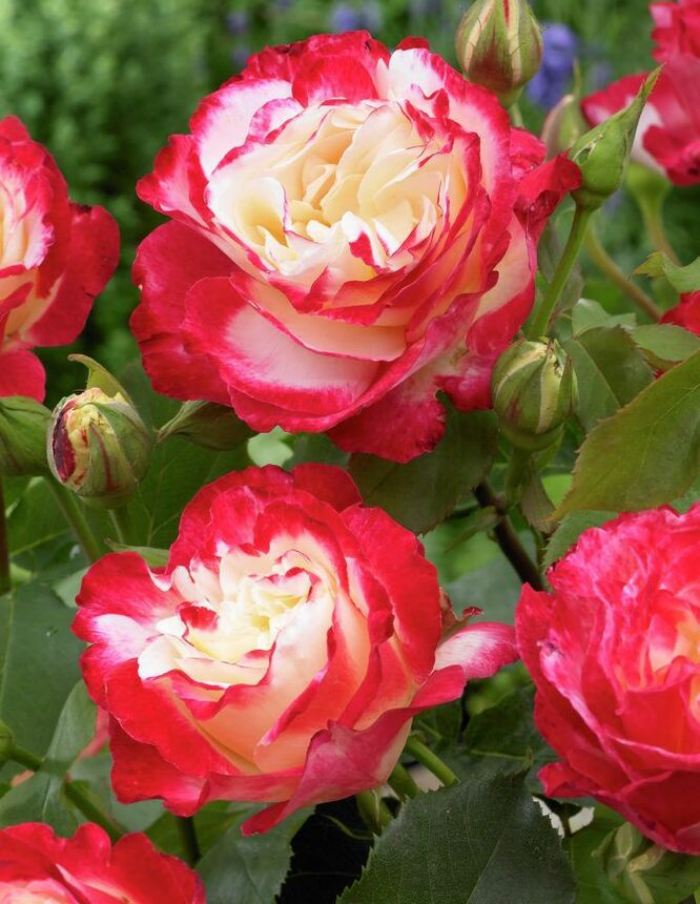 Цветки вначале кремово-белые, с красным только на внешних лепестках, но по мере распускания малиновая окраска расширяется, особенно в жаркую погоду. Цветки очень крупные, появляются обычно по одному, редко по 2-3, на длинных, жестких, колючих побегах. Аромат очень сильный, сладкий, фруктовый. Размер цветка 13-14 см. Высота 90-150 см. Ширина 60-150 смВозраст саженца1 год