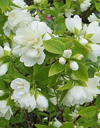 Применение,особенностиИспользуется для одиночных и групповых посадок, для живых изгородей.КустЧубушник венечный Шнеештурм (Schneesturm) представляет собой мощный, высокий – до 2,5 — 3 метров — листопадный кустарник с тонкими плакучими ветвями, которые спадают с внешней стороны кроны. Куст с множеством стволов и плотной, овальной кроной по своей форме напоминает фонтан. Растет он очень быстро, с ежегодным приростом в 45 — 50 см в высоту и 20 — 25 см — в ширину.ЛистьяНасыщенная, темно-зеленая листва садового жасмина к осени выгорает и приобретает желтую окраску. Листья 7 — 9 см длиной имеют простую, заостренно-овальную форму.ЗимостойкостьЗимостойкость средняя, до -29°C.Возраст саженца1 годУсловия выращиванияОдин из самых некапризных гибридов, не требовательных к почве. Однако чтобы сохранить характерное для сорта крупноцветковое и обильное цветение, с третьего года жизни следует ежегодно подкармливать куст органикой и минеральными комплексами.