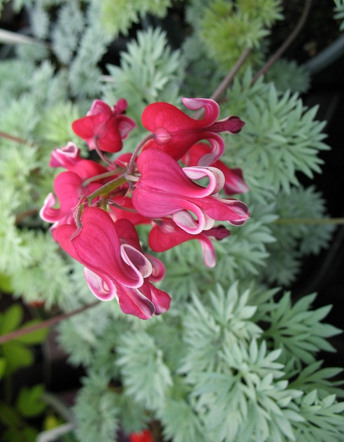 Дицентра Бёрнинг Хертс-изящное многолетнее растение. Обладает удивительными серебристо-голубыми ажурными папоротникообразными листьями. Раздвоенные сердцеобразные цветки рядками усеивают стебельковые дуги. Цветы окаймлены широкой белой полосой, расцветка цветоноса ярко-алая.