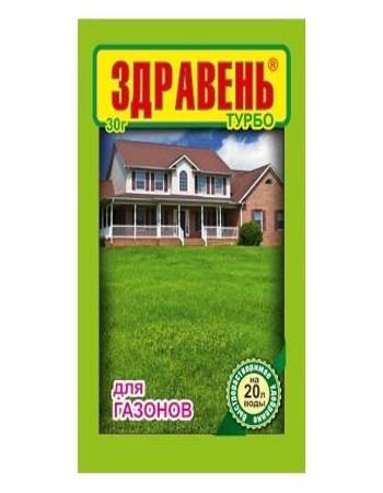ОписаниеЗдравень Турбо -быстрорастворимое комплексное органоминеральное удобрение для корневой и некорневой подкормки растений. Содержит оптимальный набор макро- и микроэлементов. Гарантирует прекрасную, густую и яркую траву на вашем газоне, помогает формированию прочной и устойчивой дернины. Повышает декоративность газона и его зимостойкость.-повышает густоту и равномерность зелёного покрытия-усиливает интенсивность окраски, придает более насыщенный цвет-повышает засухоустойчивость газонаСоставМакроэлементы азот 18%, фосфор 22%, калий 19%, магний 1,5%, кальций 2%, гумат натрия 2%; микроэлементы бор 0,03%, марганец 0,04%, в т. ч. в форме хелатов, цинк 0,02%, медь 0,02%, молибден 0,005%. Не содержит хлора.Срок годности3 годаСпособ примененияКорневую подкормку следует производить путем полива газонов. При этом рекомендуется растворять удобрение «Здравень» в теплой воде. Если стоит сухая погода, то за 1 день до подкормки газон следует полить.За сезон проводят 3 подкормки:1-ю подкормку — через 3-4 недели после таяния снега;