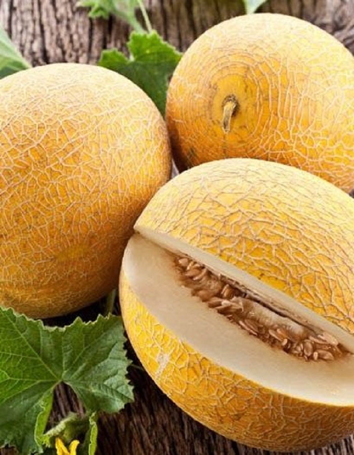 Необычайно урожайный, десертный сорт. Плоды округлые, коричнево-желтые, с густой сеткой, массой 1,5-2 кг, Мякоть кремовая, толстая, нежная, очень сочная и сладкая, тающая, с гармоничным ароматом и длительным послевкусием. Дегустационная оценка 4,8 балла.