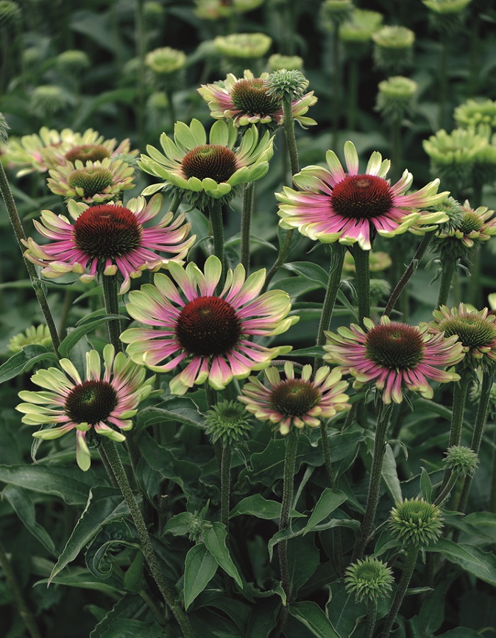 Эхинацея (Choco Green) Чоко Грин - цветет с июля до сентября, соцветия - корзинки, крупные, до 10 см в диаметре, многочисленные, краевые цветки длинные красно-розовые с зелёными кончиками, срединные более короткие, трубчатые, образуют темный помпон.