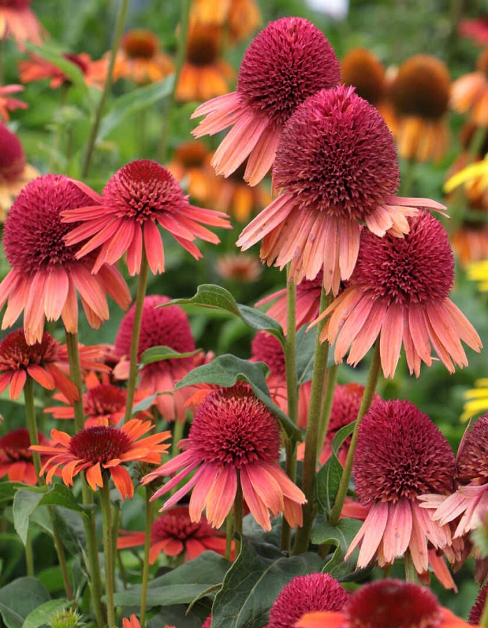 Эхинацея пурпурная Кэррот Кейк расцветает цветками богатейшей палитры оранжевых оттенков. Ее декоративность повышает красивое строение бутонов. Кажется, будто солнце распустило лучи.