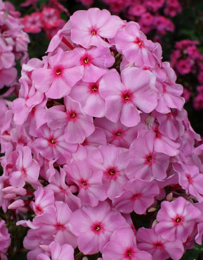 Флокс Бэбифейс - один из наиболее популярных морозостойких многолетников высотой 50 см. Особую декоративность ему придают плотные метельчатые соцветия розовой окраски с малиновым глазком. Цветки душистые диаметром 1,5см. Отличается обильным и продолжительным цветением с июля до сентября. Прекрасно смотрится в букетах, маленькими и большими группами на клумбах и рабатках.