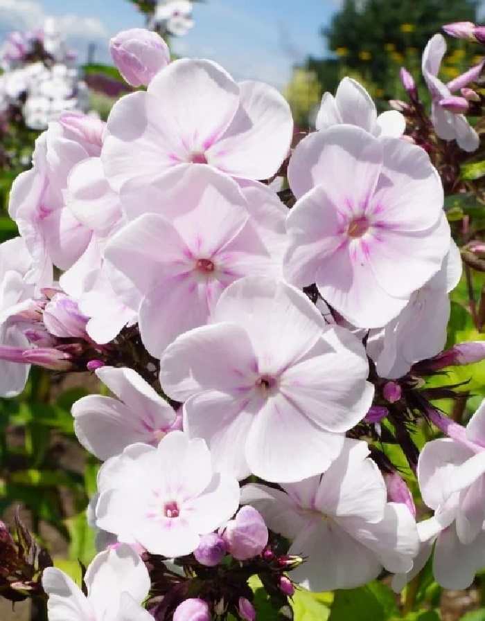 Цветки диаметром 3-4 см, бледно-перламутрово-розовые с фиолетовыми штрихами в центре и белым глазком. Бутоны и стебли тёмные. Листья с тёмным налётом. Высота взрослого растения достигает 80-100 см. Период цветения приходится на июль-сентябрь.
