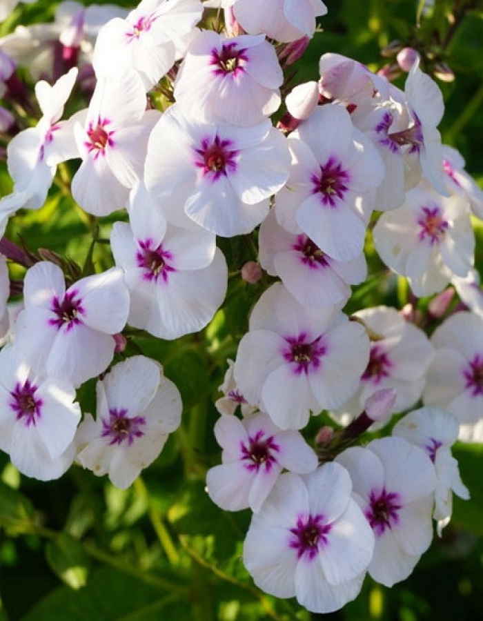 Флокс Майкс Фаворит - цветок: чисто-белый, с пурпурно-фиолетовой «снежинкой» в центре, округлый, диаметр цветка 2 – 2,5 см. Период цветения: июль-сентябрь. Высота куста: 50-70 см. Ширина куста: 50 см. Очень нежный сорт. Соцветия крупные на прямостоячих стеблях. Листья здорового темно-зеленого цвета. Устойчив к болезням. Идеален для переднего плана.