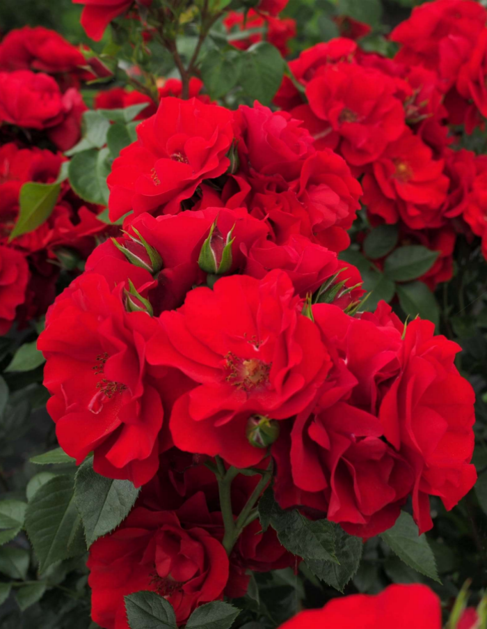 ОписаниеСложно что-то противопоставить этим крупным кистям ярко-малиновых цветков, оттененных молодой красноватой листвой. Цвет усиливается при посадке с белыми полиантовыми розами или серебристолистными многолетниками. Отдельные цветки довольно мелкие, но появляются в большом количестве, в крупных кистях по 10-30 шт. Они розетковидные, и долго не опадают. Куст быстро зацветает повторно и цветки не выгорают и не буреют на солнце. Листва темно-зеленая и блестящая, сорт сильный и устойчивый к болезням.