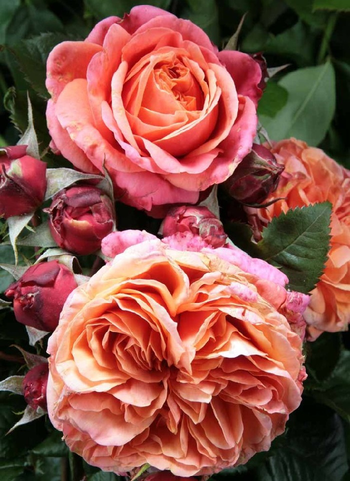 ОписаниеЦветки густомахровые, ностальгические, при открытии шаровидные, затем чашевидные, диаметром 10-12 см, оранжевые с красноватыми тонами на внешних лепестках. Отлично подходят для срезки, имеют цветонос длиной до 60 см, в вазе стоят 10-12 дней и полностью открываются. Аромат сладких фруктов, приятный, как у старинных роз. Цветение обильное, до заморозков. Листва глянцевая, тёмно-зелёная, молодая – тёмно-красная, высокоустойчивая к заболеваниям. Побеги сильные, жёсткие, прямостоячие, умеренно колючие. Кусты высотой 70-100 см, шириной 60 см. Лёгкий в выращивании сорт.