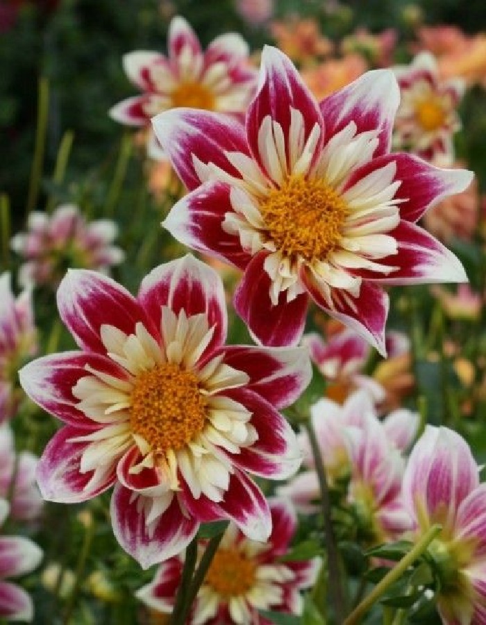 Георгина Фэшн Монгер анемовидная - очаровательный сорт с карминно-красными цветами, украшенными белыми кончиками и кольцом из нежно-желтых крошечных лепестков в центре. Обращенные к небу нежные цветы, диаметром 7–10 см, красиво и прямо стоят, даже когда идет дождь. Высота 90 см. Срок цветения в средней полосе России — август-сентябрь.