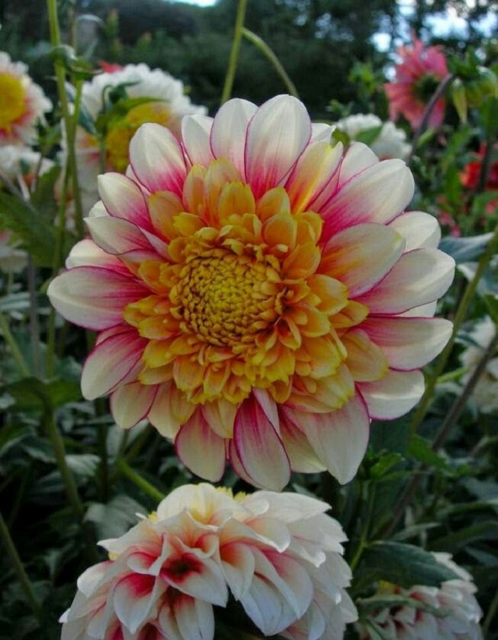 Георгина Полька (анемоновидная) – клубневое растение высотой 110см. Завораживающие цветки с желтым центром и бело-красными лепестками достигают 9см в диаметре и служат замечательным украшением сада. Роскошно цветущая георгина ценится за сравнительную легкость выращивания и очень продолжительные сроки цветения. Идеально подходит для групповых посадок. Отлично смотрится в срезке.