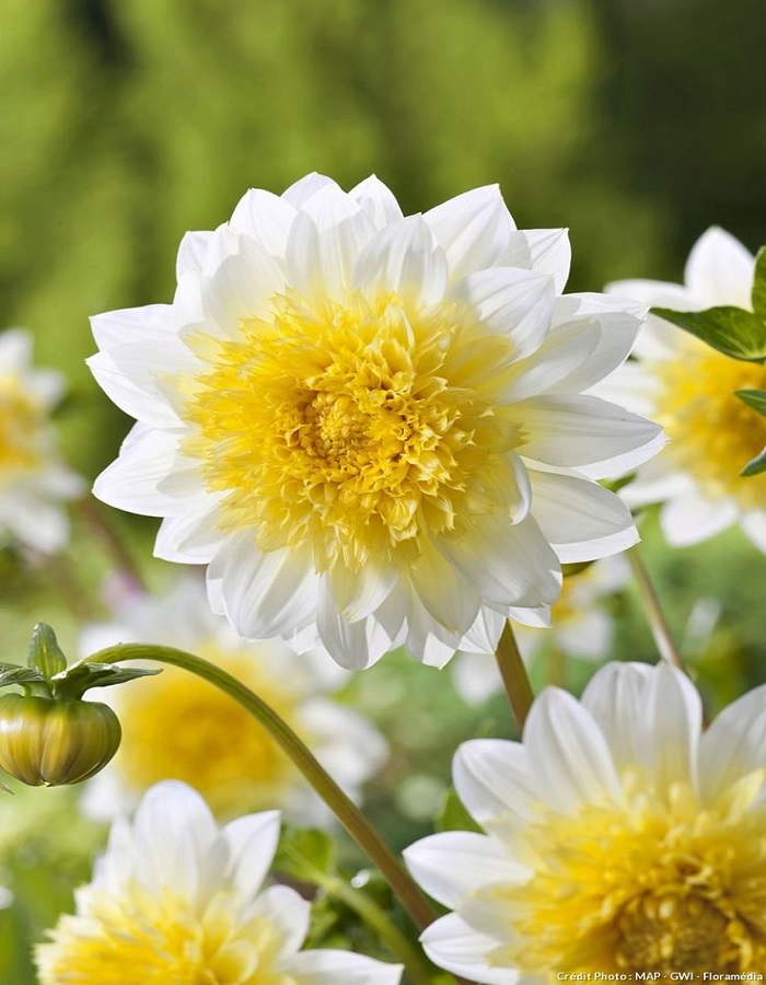 Георгина Пасадобль (анемоновидная) – клубневое растение высотой 100см. Завораживающие цветки с кремовым центром и белоснежной юбочкой достигают 12см в диаметре и служат замечательным украшением сада. Роскошно цветущая георгина ценится за сравнительную легкость выращивания и очень продолжительные сроки цветения. Идеально подходит для групповых посадок. Отлично смотрится в срезке.