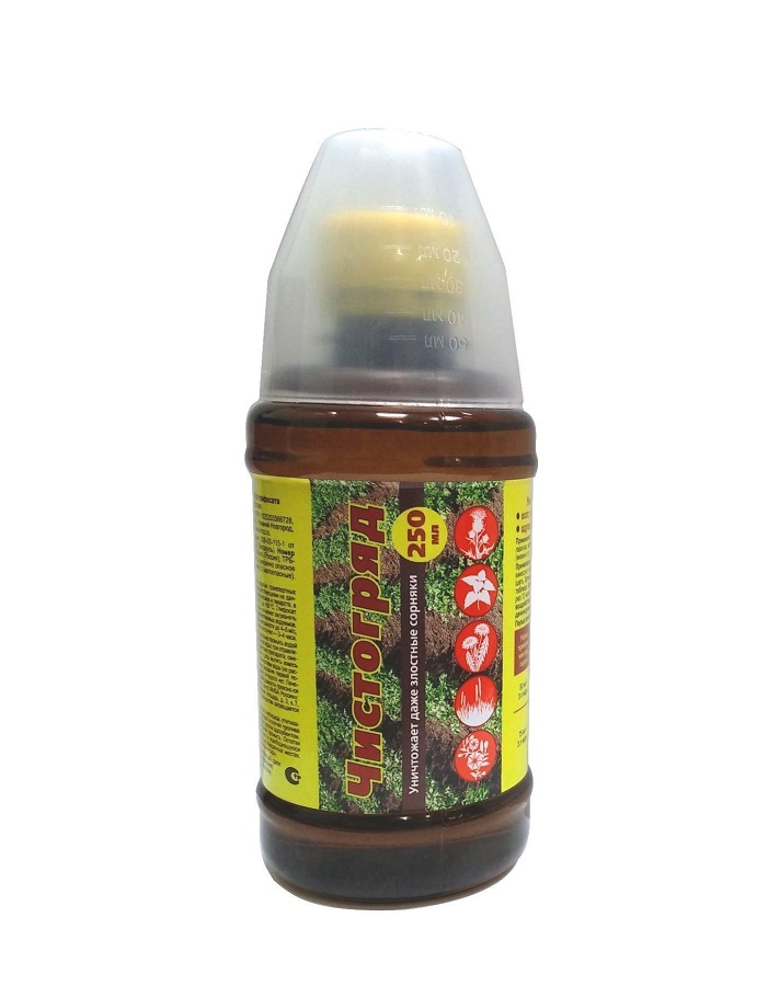 ОписаниеДля уничтожения однолетних и многолетних злаковых и двудольных сорняков, в том числе злостных. Применяется при опрыскивании вегетирующих сорняков до посадки картофеля, овощных и цветочных культур или до посева газонов, при опрыскивании сорняков в послеуборочный период, на межах и т. п. — в период вегетации.Состав360 г/л глифосата кислотыПрименениеОтмеренное количество препарата необходимо развести в пластиковой или эмалированной емкости с небольшим количеством воды (1 л) и тщательно. Затем рабочий состав довести до требуемого объема. Опрыскивание вегетирующих сорняков за 10–20 дней до посадки картофеля, овощных и цветочных культур или до посева газонов. Осеннее опрыскивание сорняко в послеуборочный период. На межах и т. п. — в период вегетации.Нормы расхода100 мл/6 л воды, Однолетние и много-