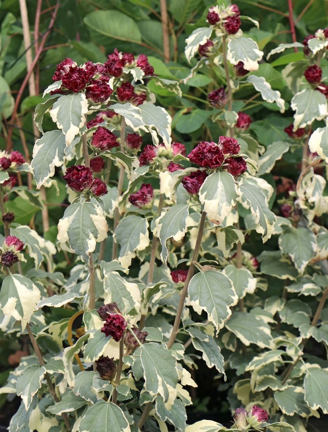 ПрименениеГибискус сирийский Пурпуреус Вариегатус (Purpureus variegatus)- листопадный кустарник семейства Мальвовые. Высоко ценится своей декоративностью. Используются для создания живых изгородей и лиственных композиций, в цветниках и даже контейнерах. Считаются одной из лучших украшений для входов в дом и приусадебных участков.КустарникМноголетний листопадный кустарник высотой 1,5 - 2 м.ЛистьяЛистья светло-зеленые с кремово-желтым, овальные, трилопастне, с округлыми или зубчатыми краями.Цветы/соцветияЦветы - до 7 см в диаметре, темно-пурпурные бордовые, махровые. одновременно на кусте может быть до 100 цветков. Период цветения - июль-октябрь.ЗимостойкостьЗимостойкость средняя, до -23 °C.Возраст саженца1 годУсловия выращиванияГибискус Пурпуреус Вариегатус (Purpureus variegatus) легко выращивается в средних почвах с хорошим дренажем, на открытых солнечных участках.